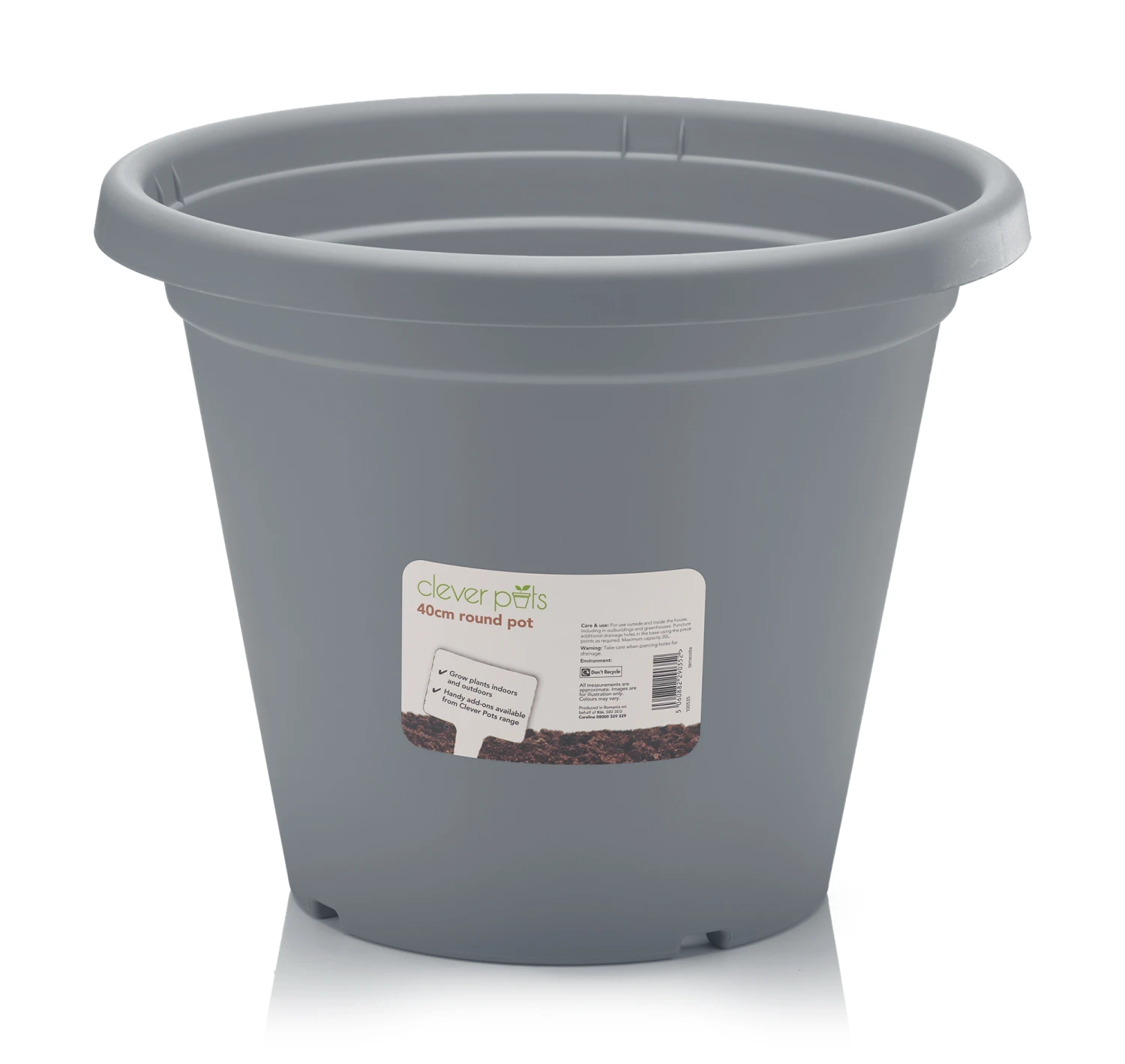Dieser runde 40 cm Pflanztopf von clever pots ist aus leichtem, witterungsbeständigem Kunststoff gefertigt und eignet sich daher perfekt für den Außenbereich. Der Topf hat einen breiten Rand, der das Aufheben und Bewegen erleichtert, und kleine Füße, die die Luftzufuhr zu den Pflanzenwurzeln für ein gesundes Wachstum ermöglichen. Hergestellt aus 30% recyceltem Kunststoff und recycelbar. Dieser Topf ist außerdem UV-farbbeständig, langlebig und wiederverwendbar.