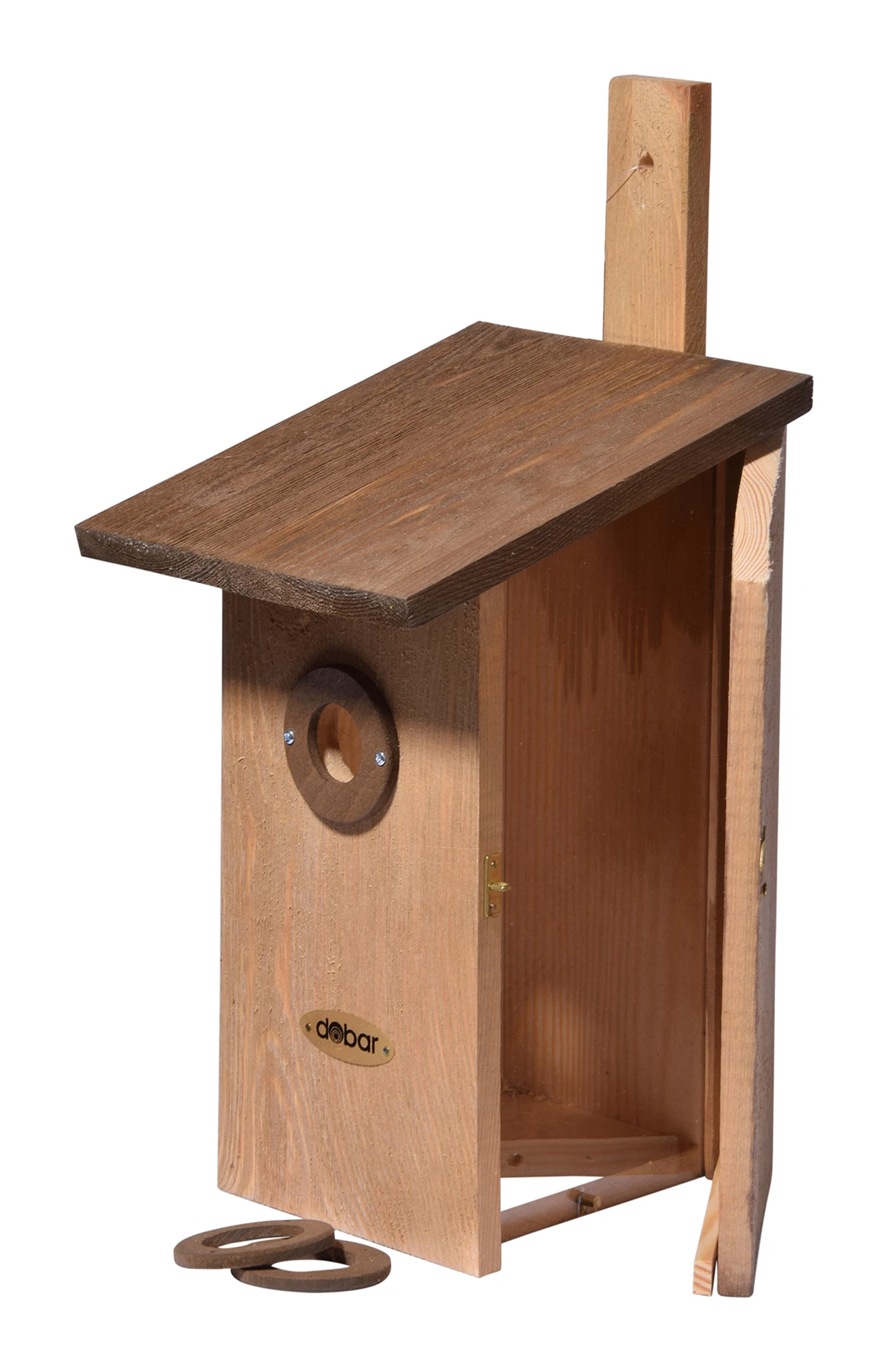 Der Beobachtungsnistkasten „Einblick“ bietet besondere Einblicke in die Kinderstube seiner Bewohner.Mithilfe des Spiegels auf der Innenseite des aufklappbaren Daches können die Jungvögel beobachtet werden, ohne dass die Brut gestört wird.