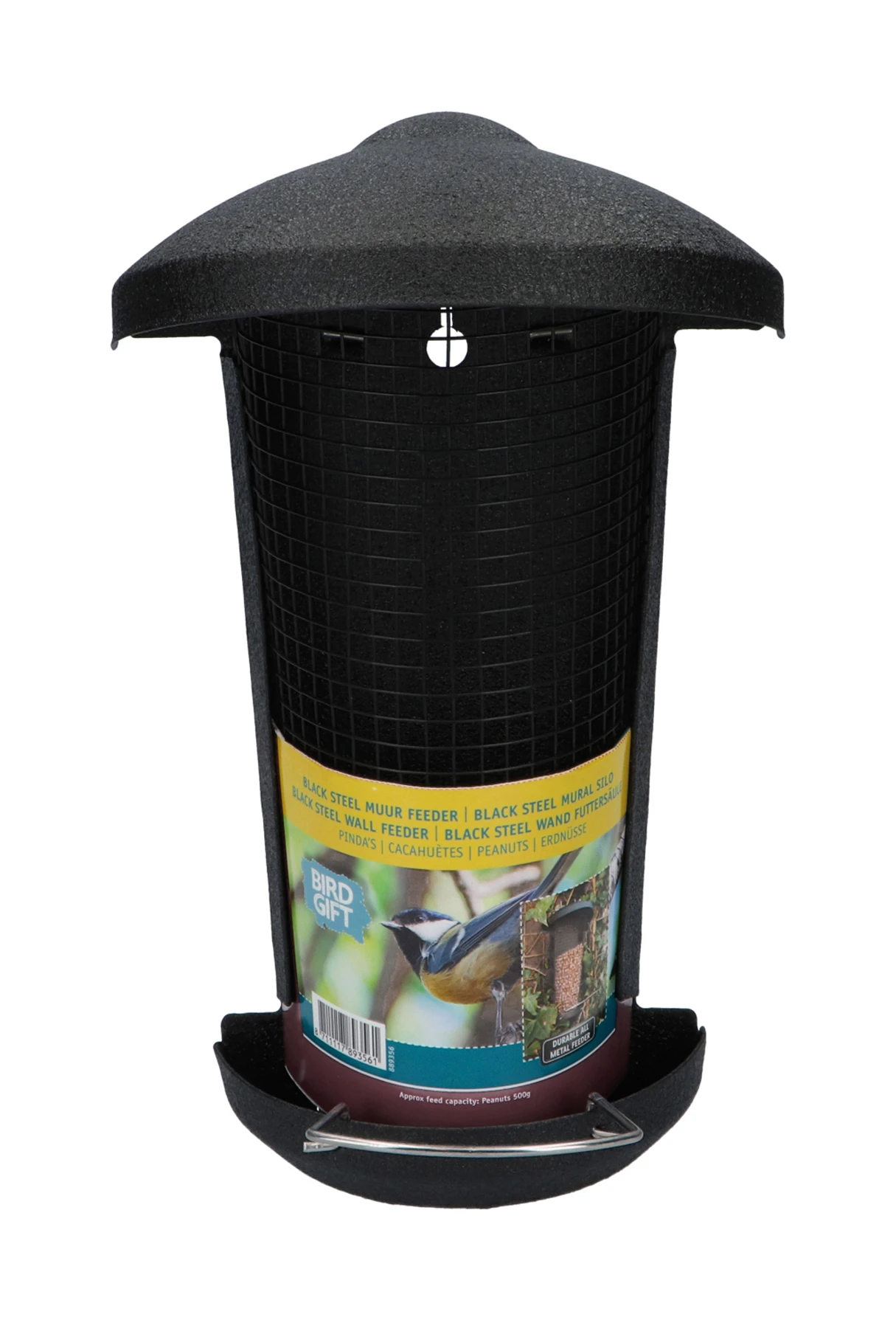 Robuster Futterautomat aus Metall, geeignet für die Wand- oder Zaunmontage.