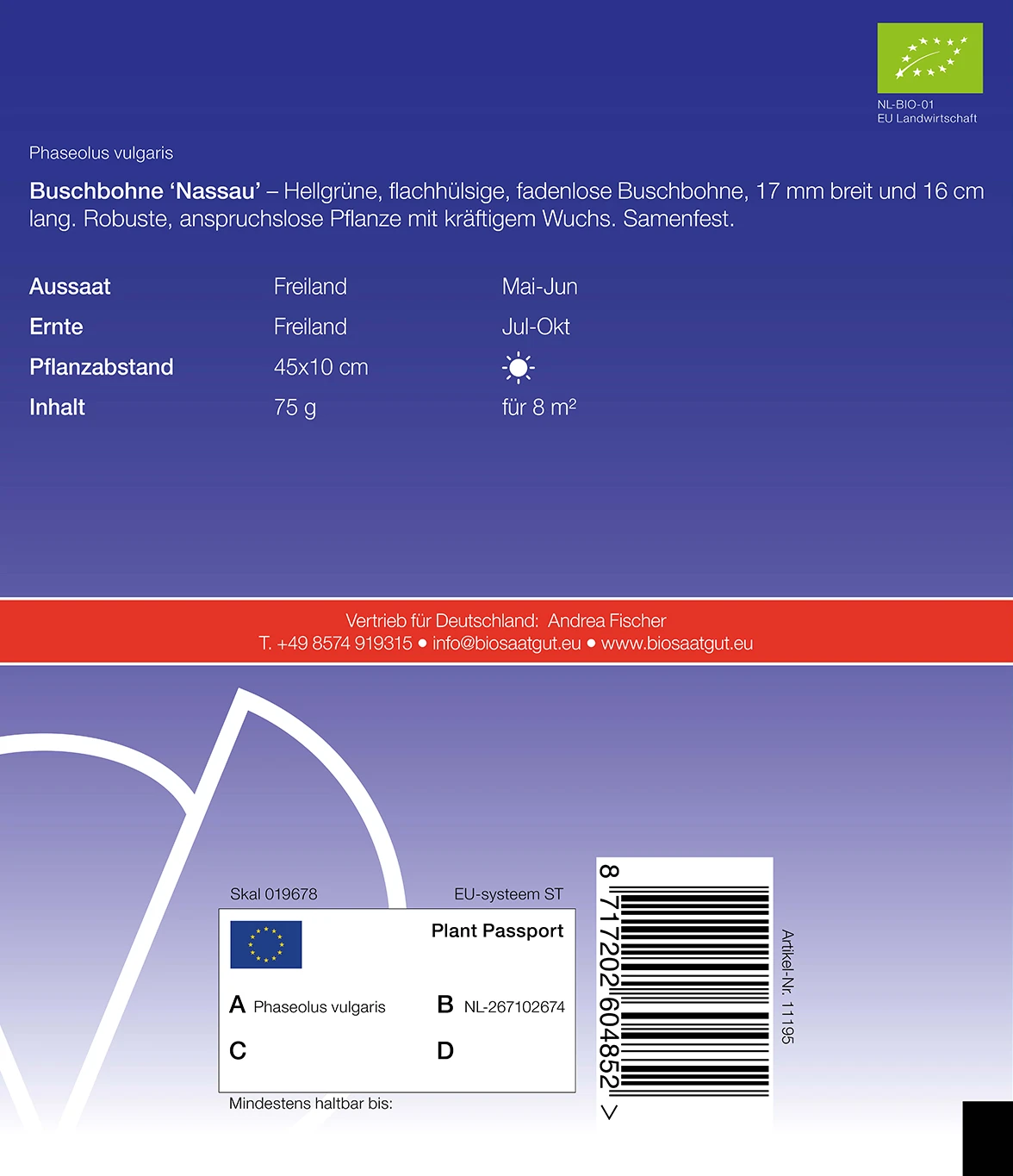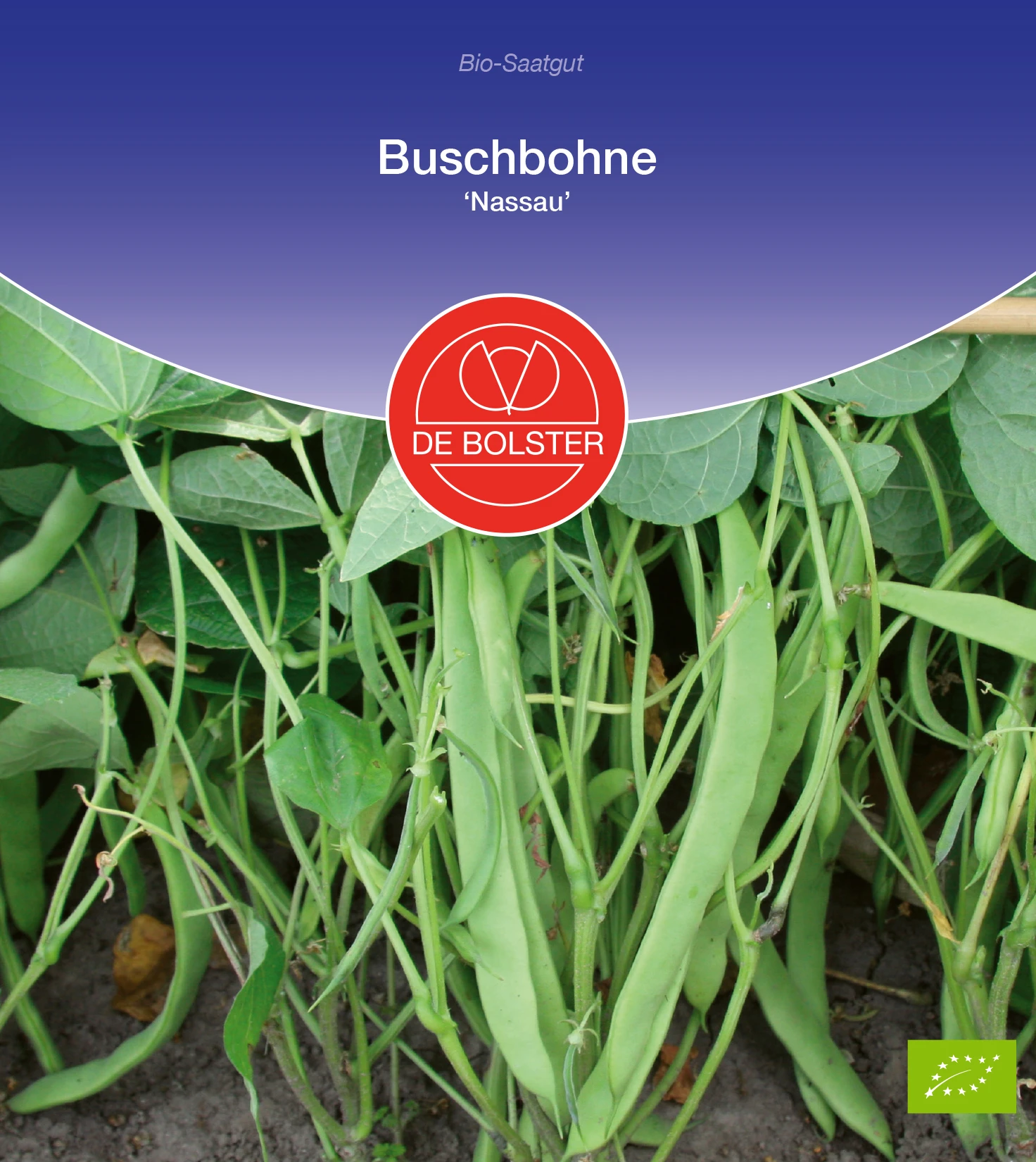 Hellgrüne, flachhülsige, fadenlose Buschbohne, 17 mm breit und 16 cm lang. Robuste, anspruchslose Pflanze mit kräftigem Wuchs. Samenfest.