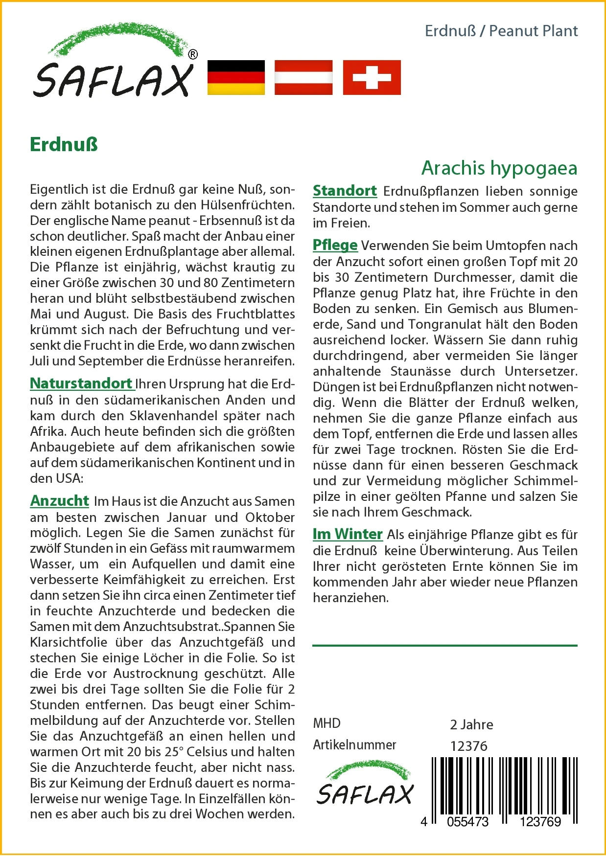 Eigentlich ist die Erdnuß gar keine Nuß, sondern zählt botanisch zu den Hülsenfrüchten. Der englische Name peanut – Erbsennuß ist da schon deutlicher. Spaß macht der Anbau einer kleinen eigenen Erdnußplantage aber allemal. Die Pflanze ist einjährig, wächst krautig zu einer Größe zwischen 30 und 80 Zentimetern heran und blüht selbstbestäubend zwischen Mai und August. Die Basis des Fruchtblattes krümmt sich nach der Befruchtung und versenkt die Frucht in die Erde, wo dann zwischen Juli und September die Erdnüsse heranreifen.