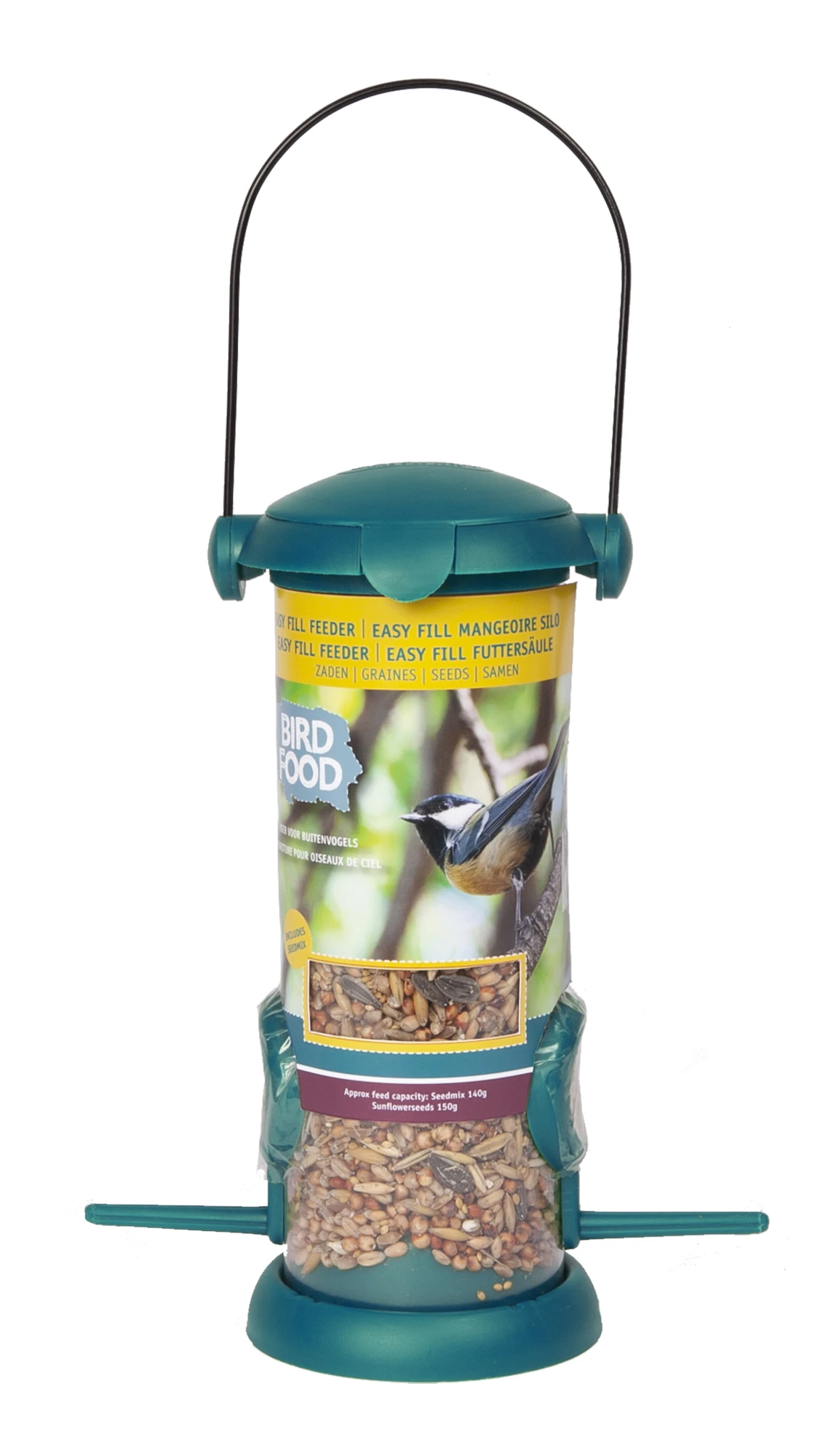 Der Futterspender besteht aus strapazierfähigem Kunststoff und Metall. Zum Nachfüllen leicht zu öffnen.