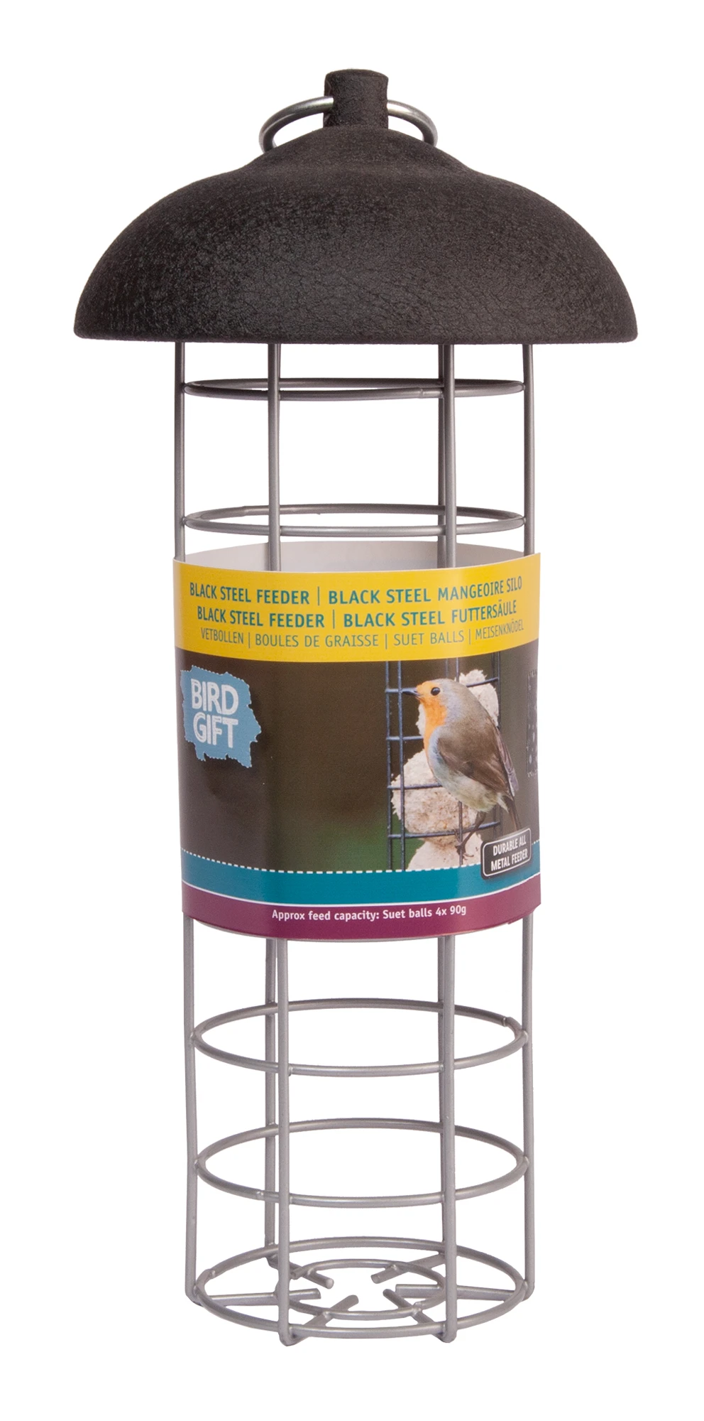 Der Black Steel Futterspender verfügt über einen schwarzen Stahldeckel, den Sie mit einem Twist-Click-System am Futterspender befestigen können. Der Futterautomat hat auch eine abnehmbare Basis, auf der die Vögel möglicherweise sitzen können. Dieser Feeder mit einer robusten Stahlkonstruktion ist leicht zu füllen und zu reinigen. Der Futterspender ist einfach zu bedienen und kann mit Meisenknödel befüllt werden.
