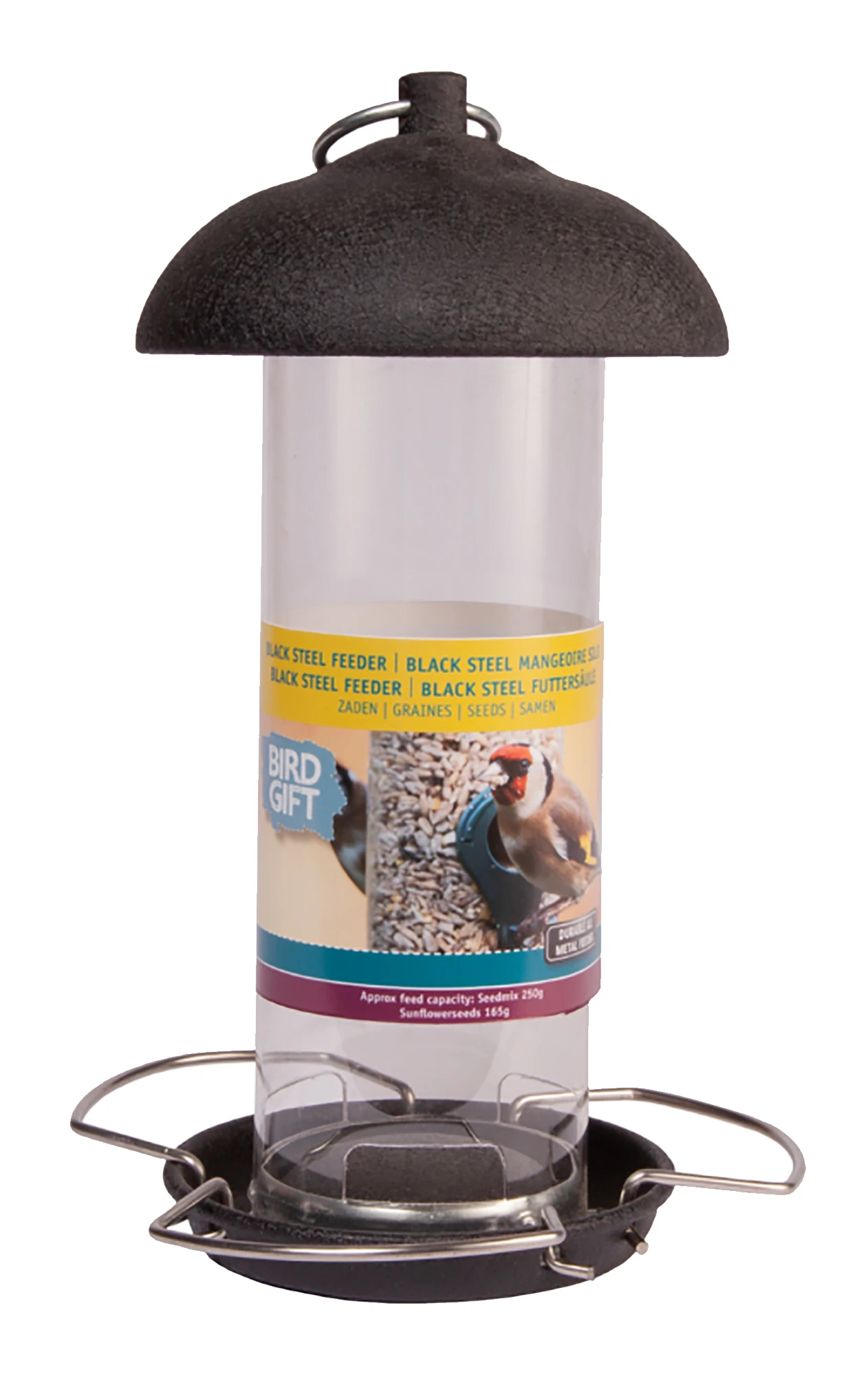 Der Black Steel Peanuts Futterspender verfügt über einen schwarzen Stahldeckel, den Sie mit einem Twist-Click-System am Futterspender befestigen können. Der Futterautomat hat auch eine abnehmbare Basis, auf der die Vögel möglicherweise sitzen können. Dieser Feeder mit einer robusten Stahlkonstruktion ist leicht zu füllen und zu reinigen. Der Futterspender ist einfach zu bedienen und kann mit Sämereien befüllt werden.
