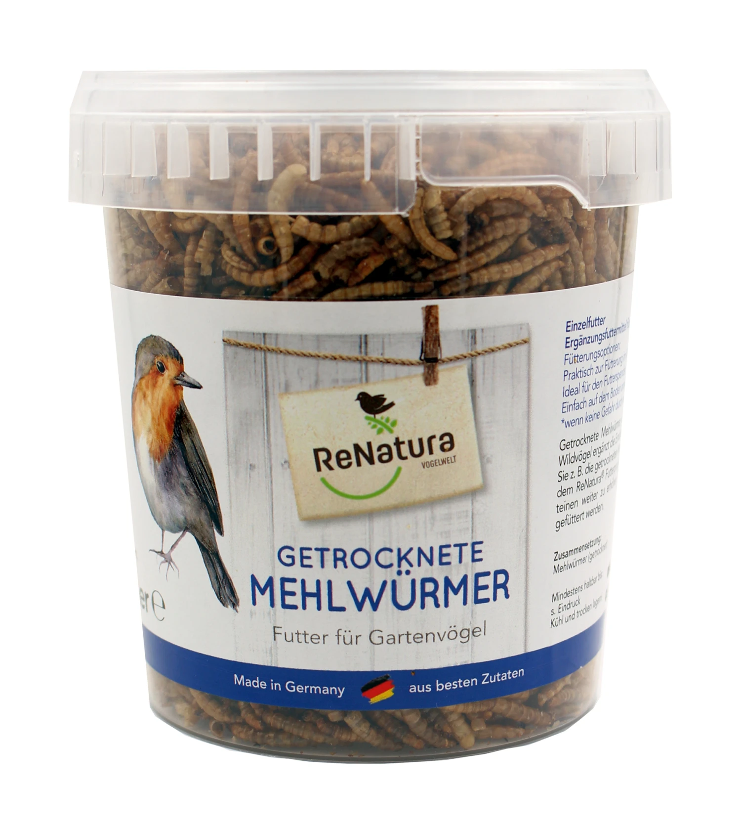 Hierbei handelt es sich um eine natürliche Eiweißquelle, die im Winter und auch zu anderen Jahreszeiten gerne von freilebenden Vögeln angenommen wird. Ein Hochgenuss für Weichfutterfresser, wie beispielsweise Rotkehlchen und Amseln. Jedoch fressen auch die meisten Vögel der anderen Futtertypen ausgesprochen gerne Insekten und sind somit auch dankbare Abnehmer der Mehlwürmer. Sie eignen sich auch zur Fütterung von Fischen, Nagern und Reptilien, sind reich an Proteinen, Mineralien und Vitaminen und eine echte Alternative zu Lebendfutter, die den Speiseplan der Tiere mit wertvollen Nährstoffen ergänzen. Die Getrockneten Mehlwürmer von ReNatura eignen sich hervorragend dazu, Futtermischungen zu ergänzen und aufzuwerten.