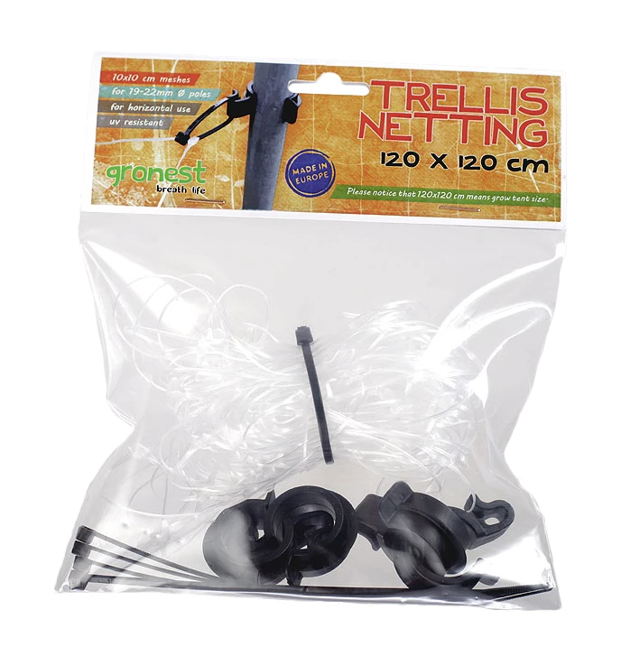 Dieses Gronest Pflanzenstütznetz hat eine Größe von ca. 110 x 110 cm und ist passend für 120 x 120 cm Growboxen und Stangen mit 15 – 18 mm Durchmesser. Das Netz ist UV beständig und hat eine Maschenbreite von 10 x 10 cm.
