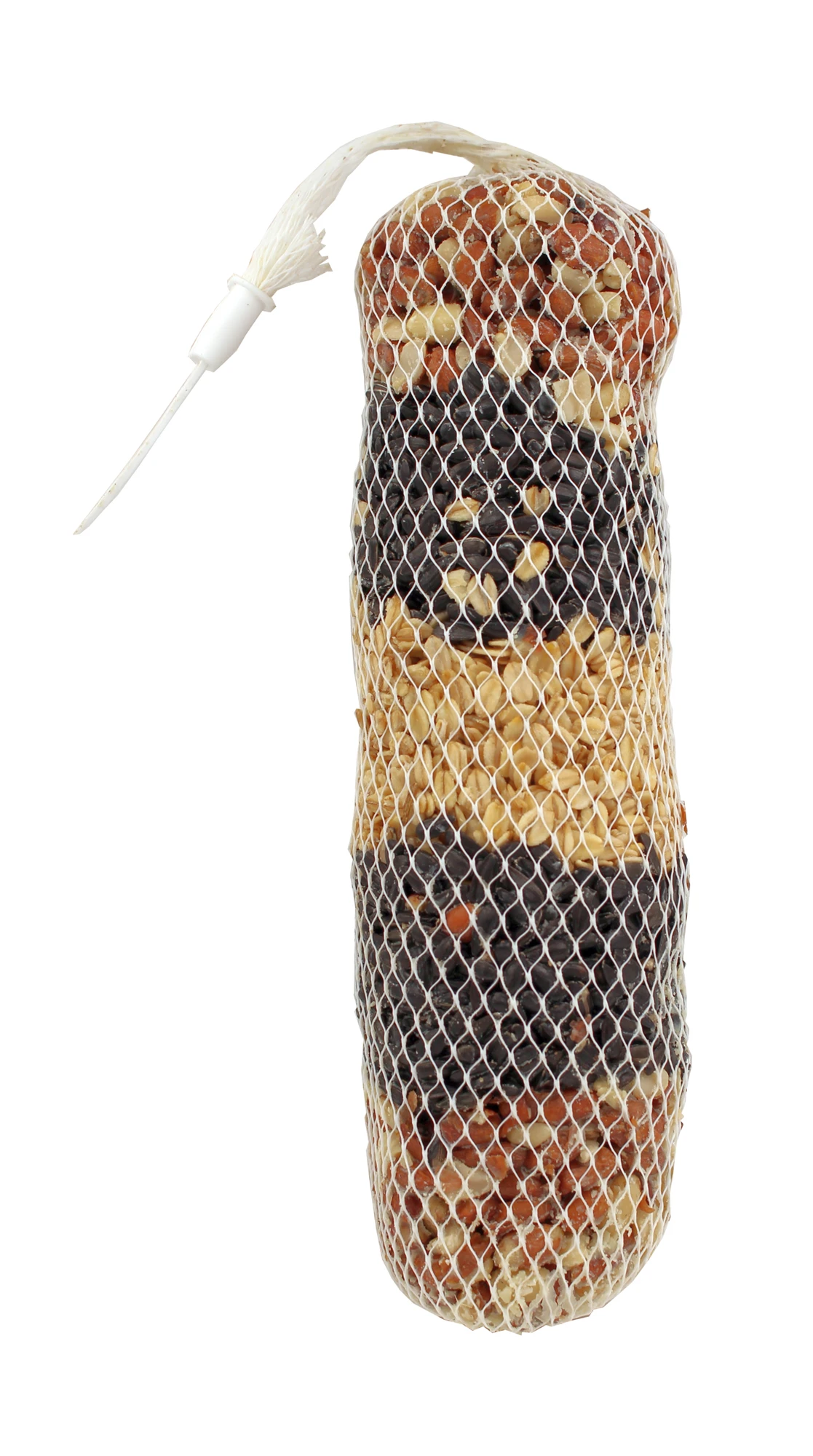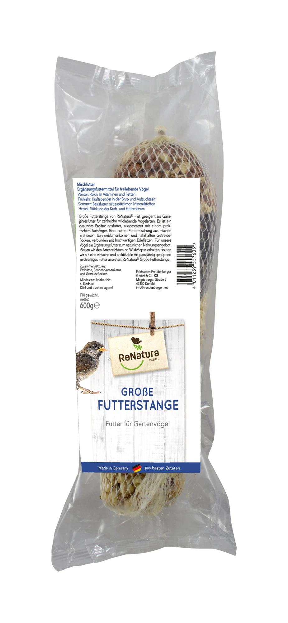 Die Große Futterstange von ReNatura besteht aus Erdnüssen, Sonnenblumenkernen und Getreideflocken. Diese hochwertigen Zutaten tragen dazu bei, freilebende Vögel auch durch kalte Winter gesund und stark zu bringen. Große Futterstangen erhalten Sie im Netz mit einer praktischen Schlaufe zum Aufhängen. Die Stange kann so an jedem passenden Ort einfach platziert werden, im günstigsten Fall an einer gut beobachtbaren Stelle. So kann das emsige Treiben gut beobachtet werden. Durch seine Zusammensetzung ist die Futterstange besonders bei Kernbeißern beliebt, die sich die schmackhaften Sonnenblumenkerne und Erdnüsse herauspicken.