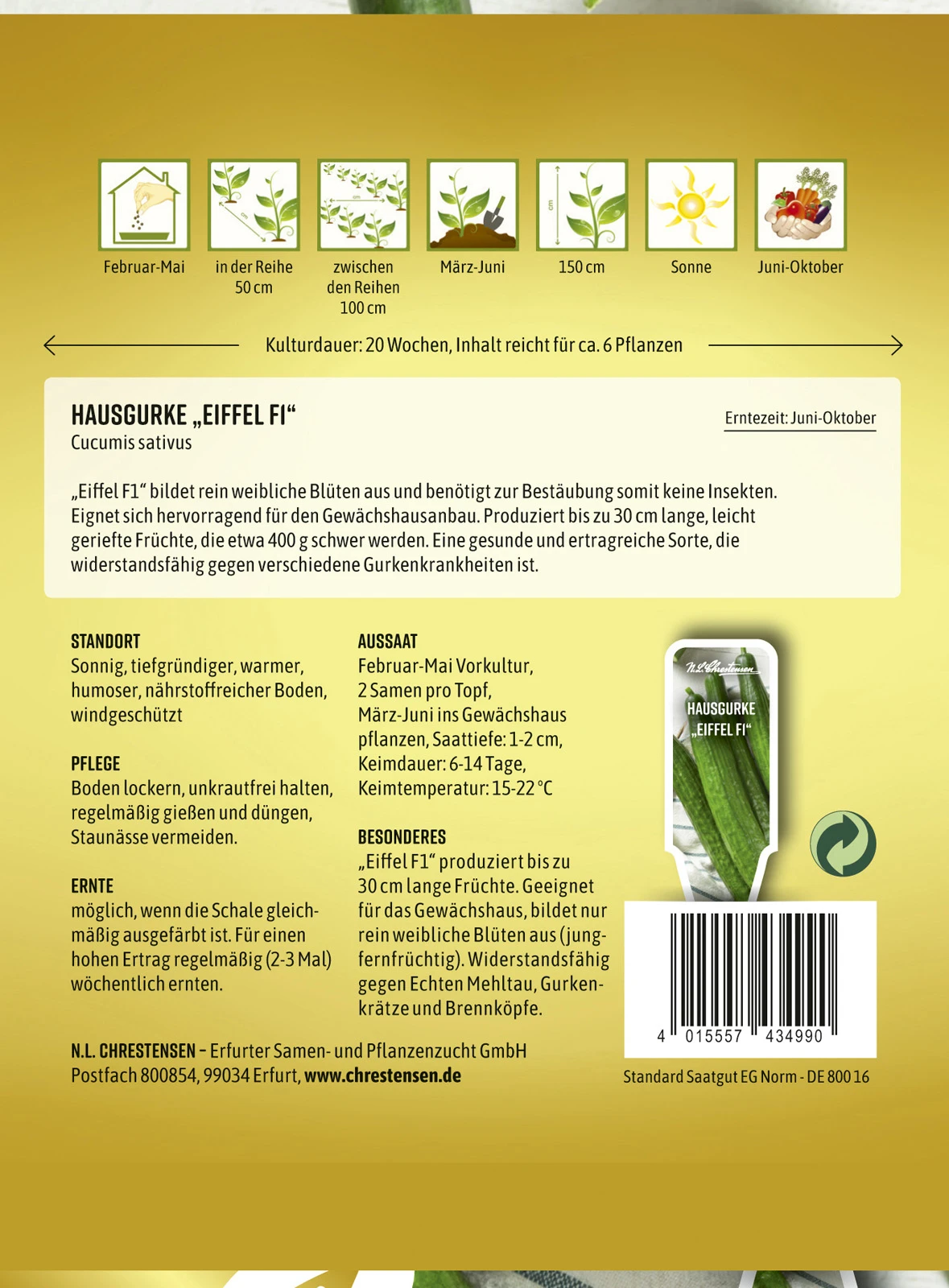 „Eiffel F1“ bildet rein weibliche Blüten aus und benötigt zur Bestäubung somit keine Insekten. Eignet sich hervorragend für den Gewächshausanbau. Produziert bis zu 30 cm lange, leicht geriefte Früchte, die etwa 400 g schwer werden. Eine gesunde und ertragreiche Sorte, die widerstandsfähig gegen verschiedene Gurkenkrankheiten ist.