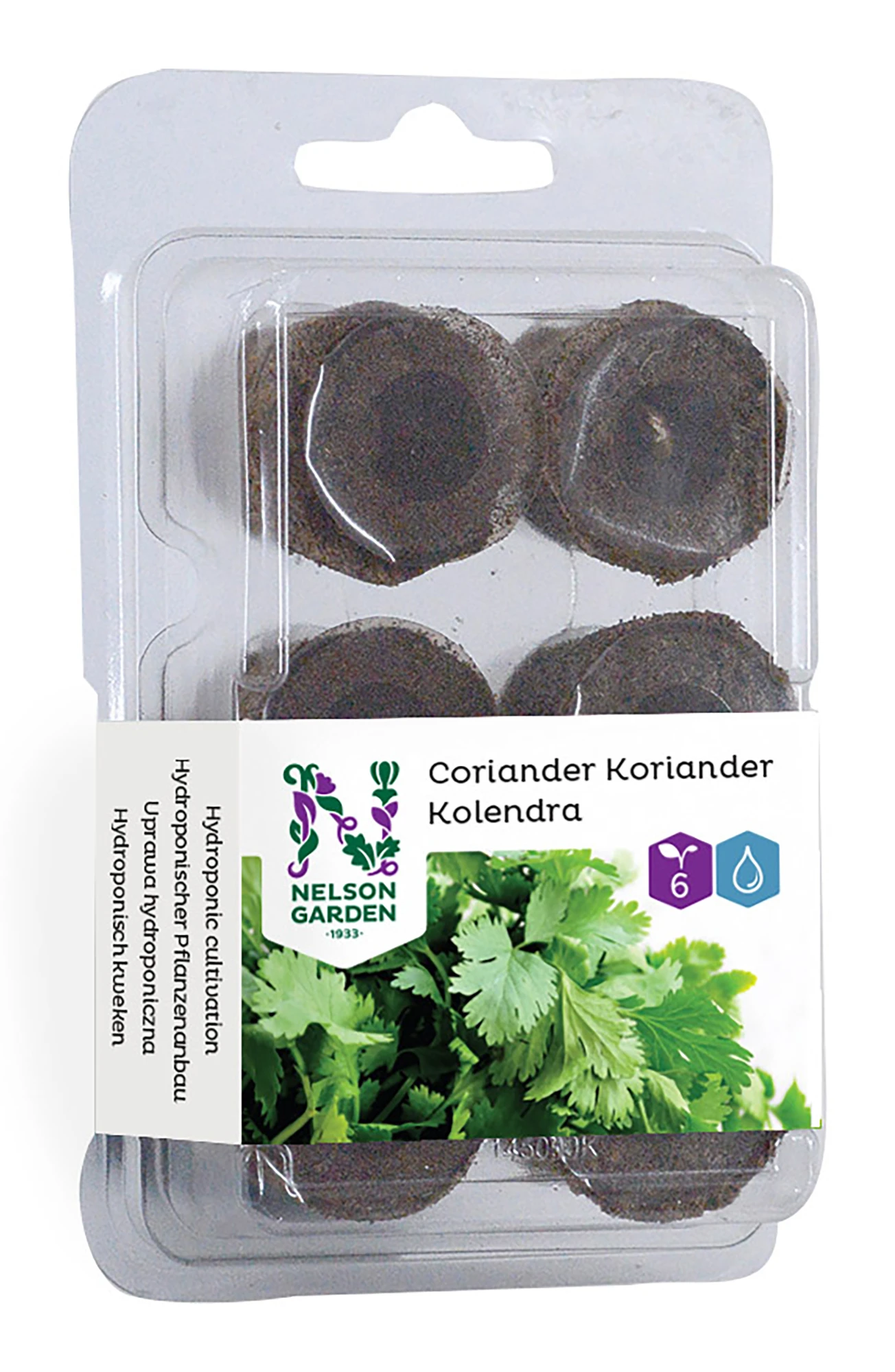 6 Quelltabletten aus kompostierbaren Kokosfasern, Torf, etwas Dünger; vorgesät mit Koriander. Geeignet für Hydroponik, d. h. Pflanzenkultur in Wasser.