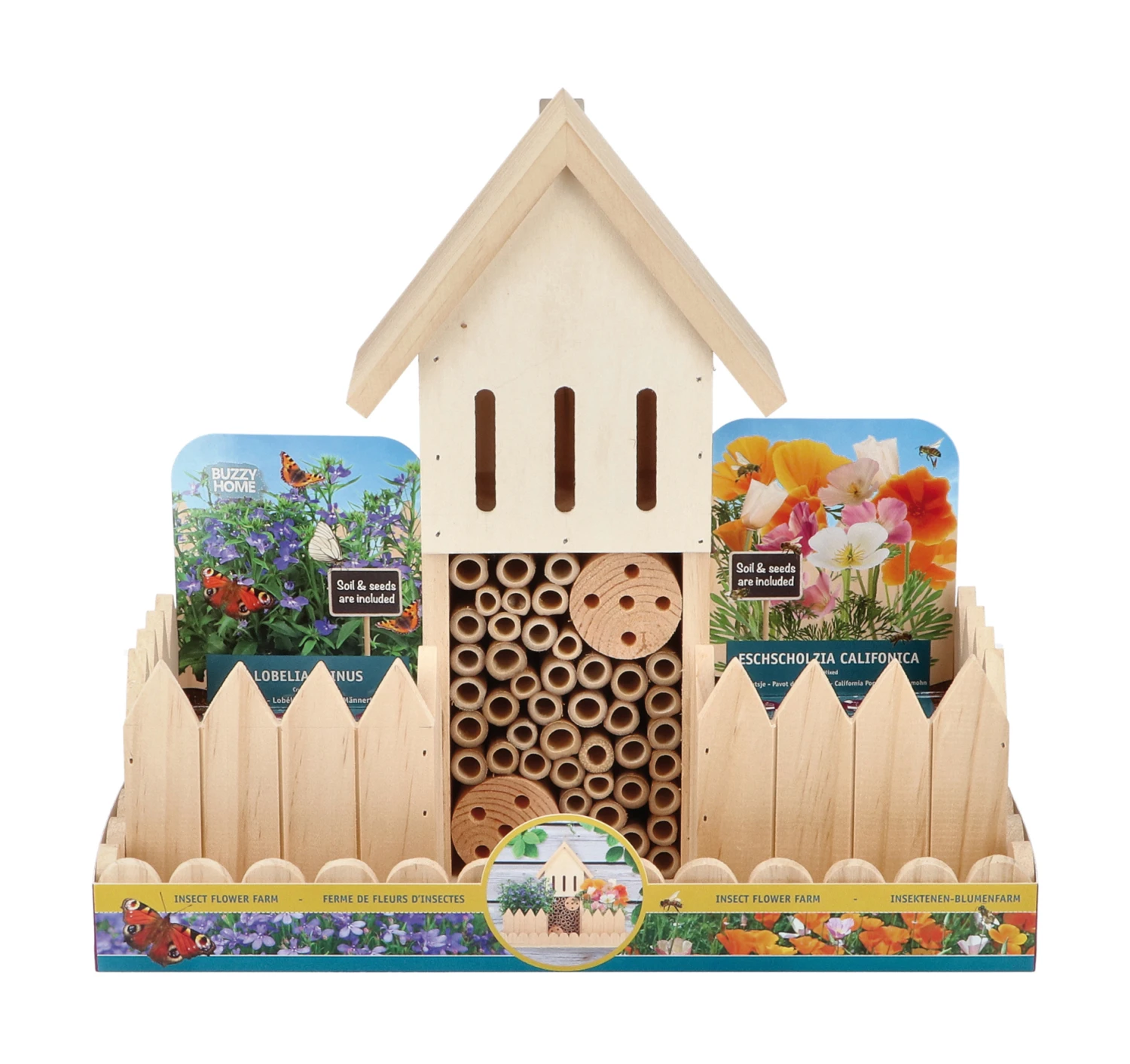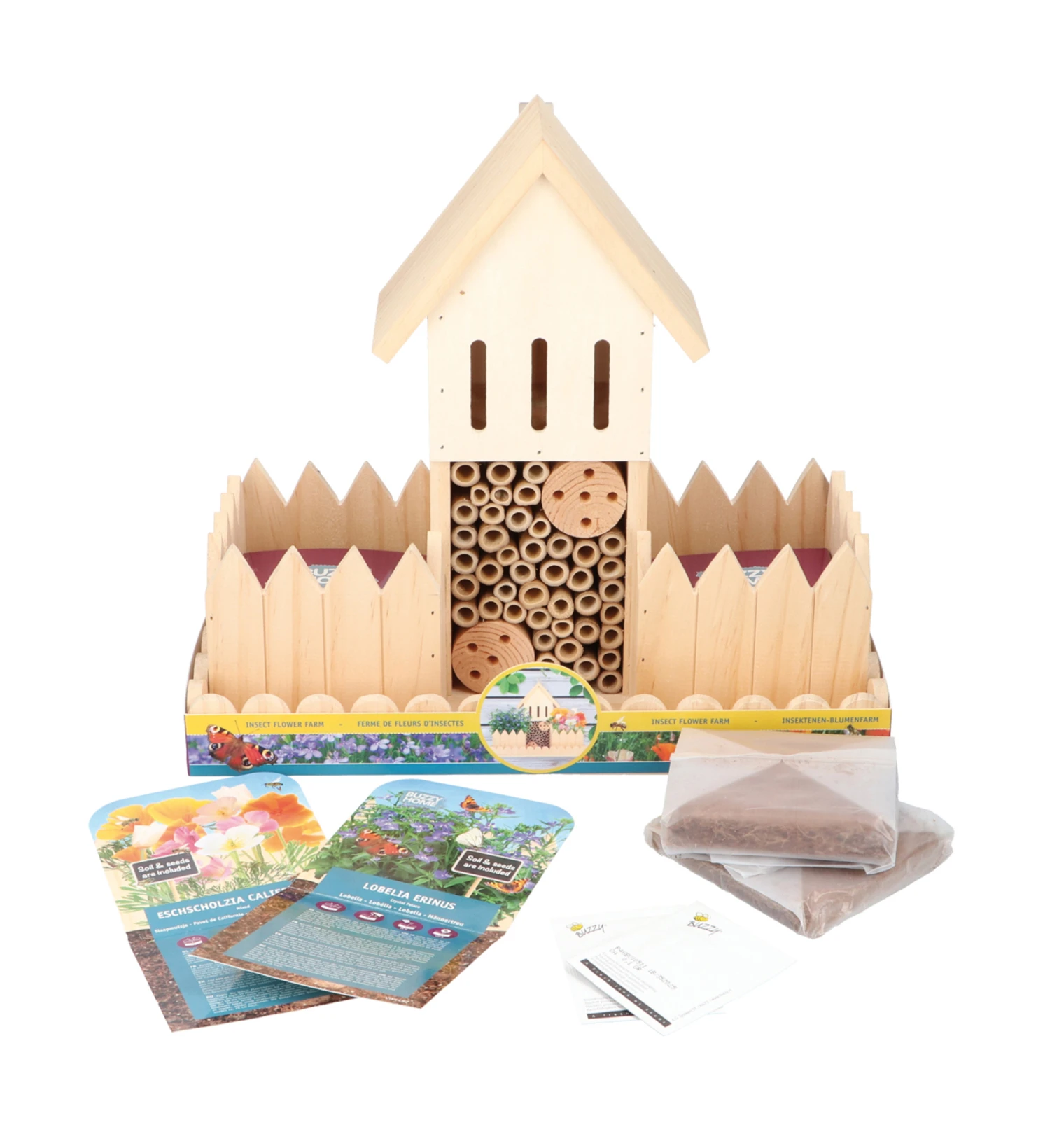 Schmetterlings- und Bienennistkasten mit den attraktiven Blüten Lobelia und Kalifornischer Mohn. Die Torftablette in Wasser einweichen, bis sich ein feuchter Boden gebildet hat. In diese können Sie die Samenmischung von April bis Juni aussäen und die Bienen und Schmetterlinge haben den Sommer mit schönen Blüten in der Nähe ihres Nistkastens.