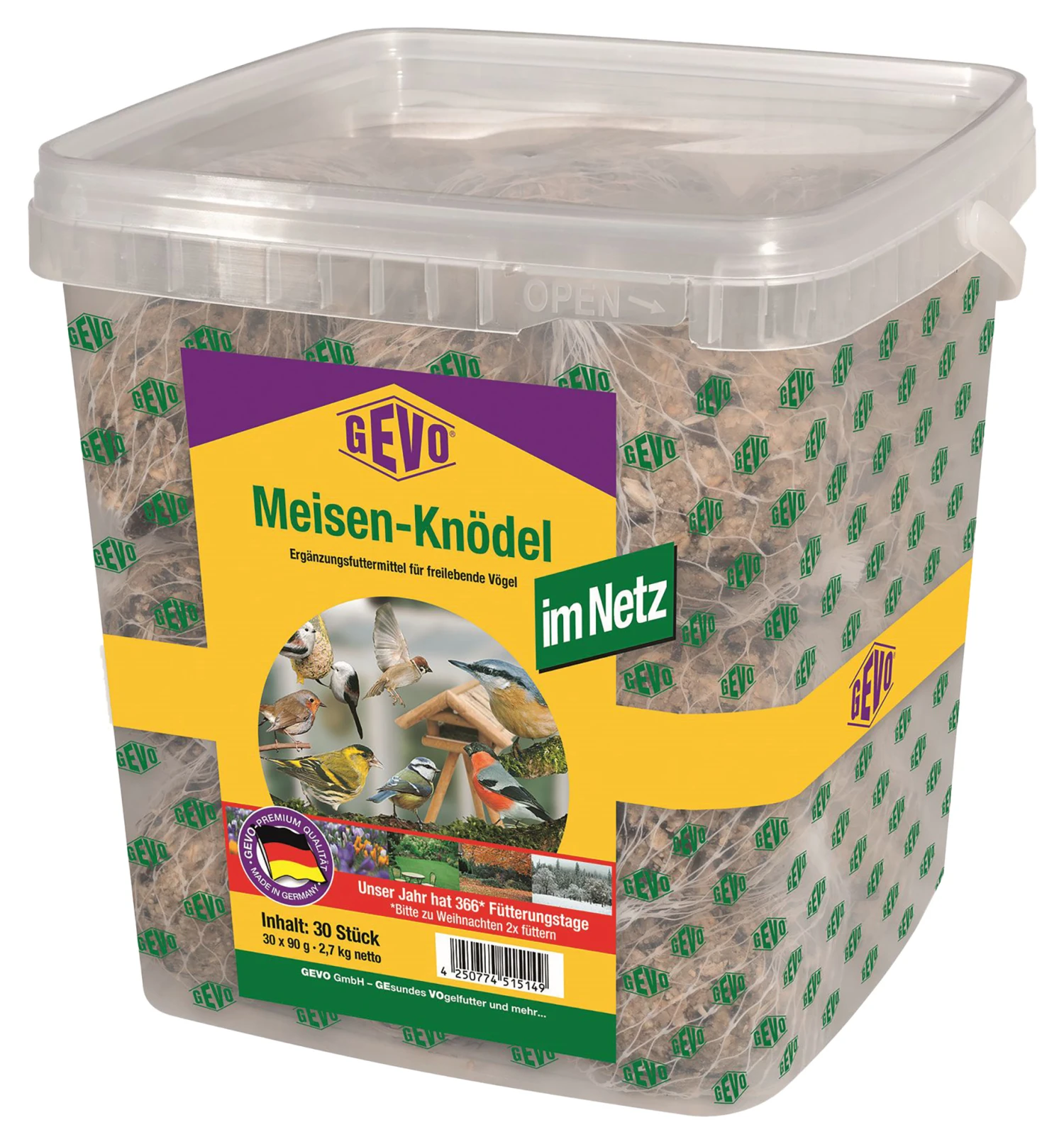 Unsere lockeren und strukturreichen GEVO-Meisenknödel im 6er Pac erreichen ihre hervorragende Konsistenz durch einen hohen Anteil sichtbarer, grober Komponenten, wie kernige Hafer- und Weizenflocken (Lebensmittelqualität), energie- und fettreiche Erdnusssplits, Sonnenblumenkerne, reich an wertvollen Proteinen und hochverdaulichem Fett sowie wichtigen Mineralstoffen. Ein sehr hoher Anteil an hochwertigem Rindertalg und Schweineschmalz gibt unseren -Meisenknödeln die nötige Konsistenz und sorgt dafür, dass sie als Leckerbissen von allen freilebenden Vögeln bevorzugt aufgenommen werden.