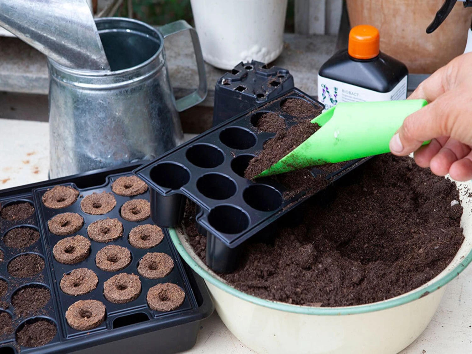 Kleine Topfplatte mit 14 Töpfen für Erde oder Quelltabletten. Vereinfacht Aussaat, Vorkultur und Umtopfen. Auf einem Untersetzer oder in einer Schale anordnen, mit Plastikfolie oder Deckel abdecken. Aus Polystyrol (PS).