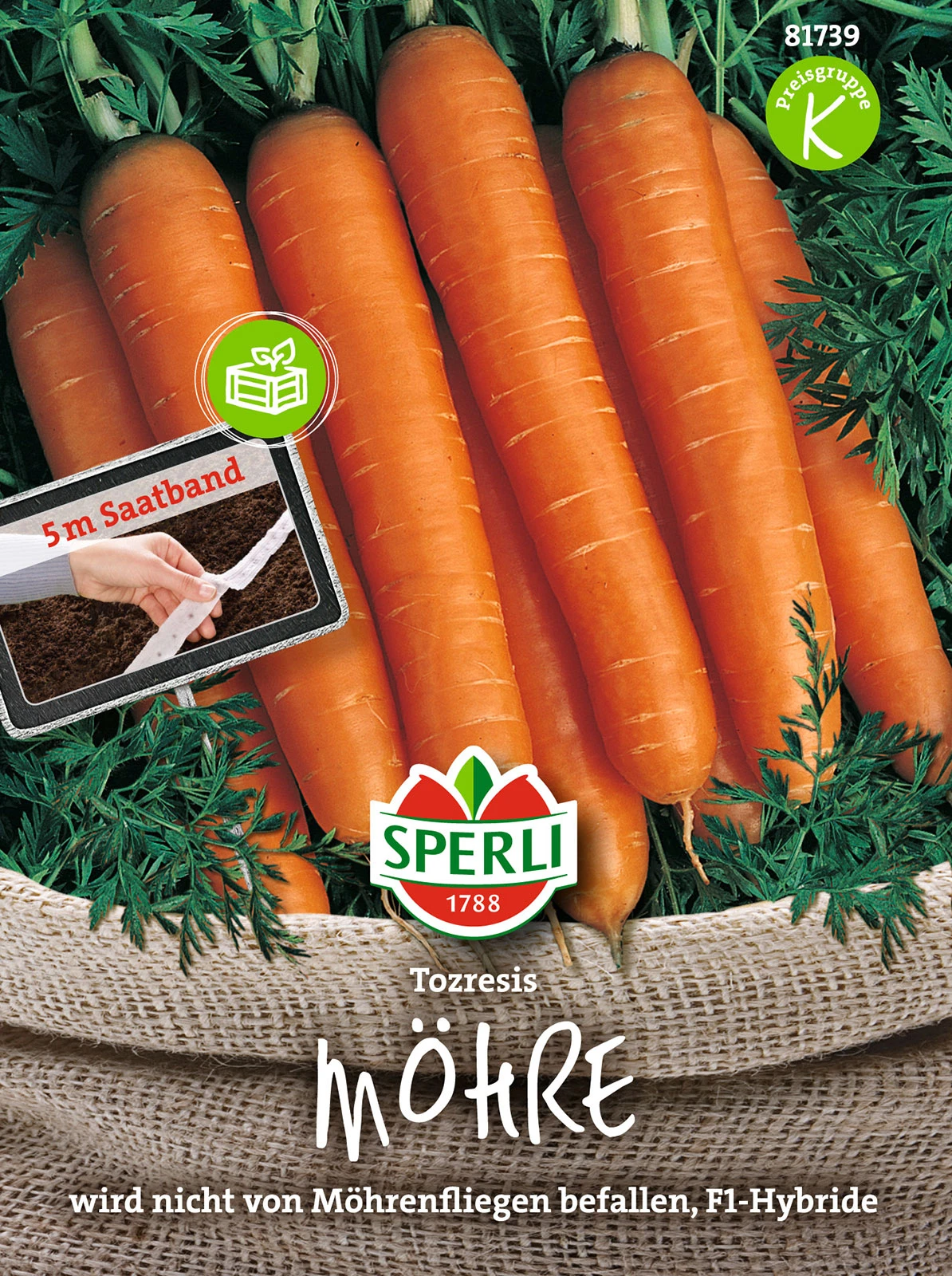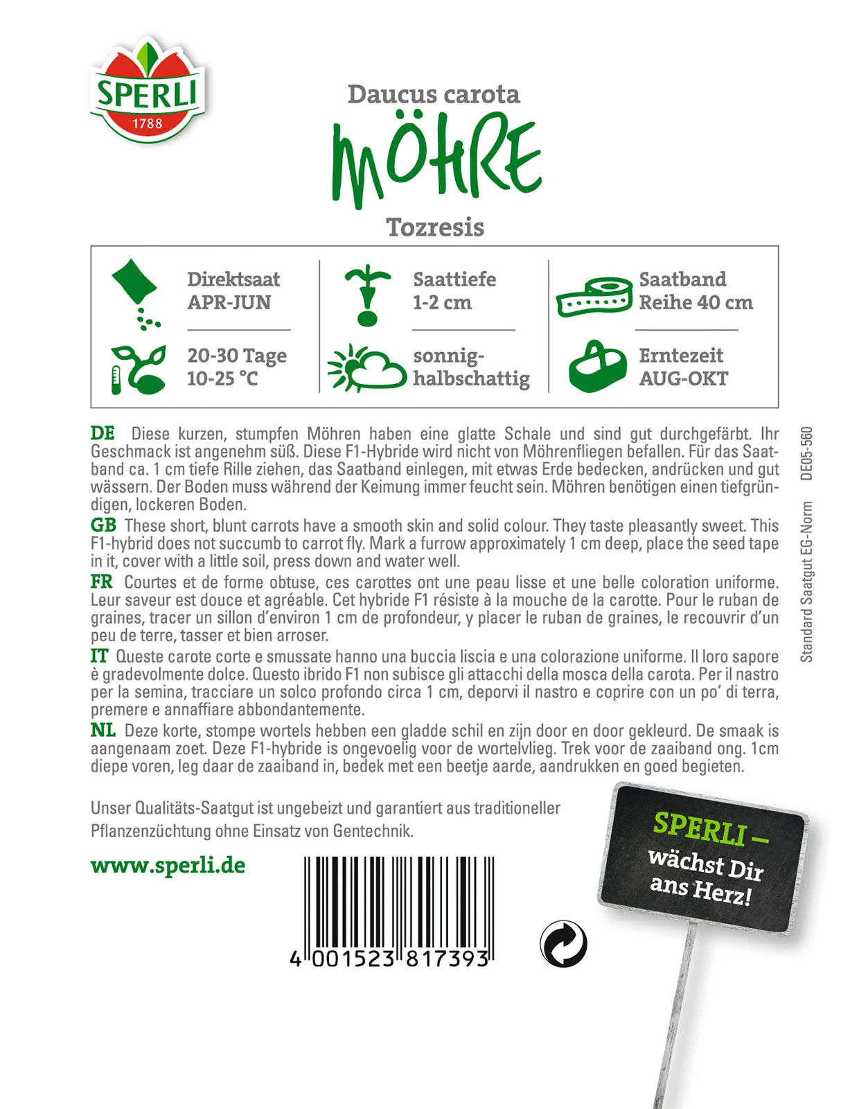 Diese kurzen, stumpfen Möhren haben eine glatte Schale und sind gut durchgefärbt. Ihr Geschmack ist angenehm süß. Diese F1 – Hybride wird nicht von Möhrenfliegen befallen. Für das Saatband ca. 1 cm tiefe Rille ziehen, das Saatband einlegen, mit etwas Erde bedecken, andrücken und gut wässern. Der Boden muss während der Keimung immer feucht sein. Möhren benötigen einen tiefgründigen, lockeren Boden.