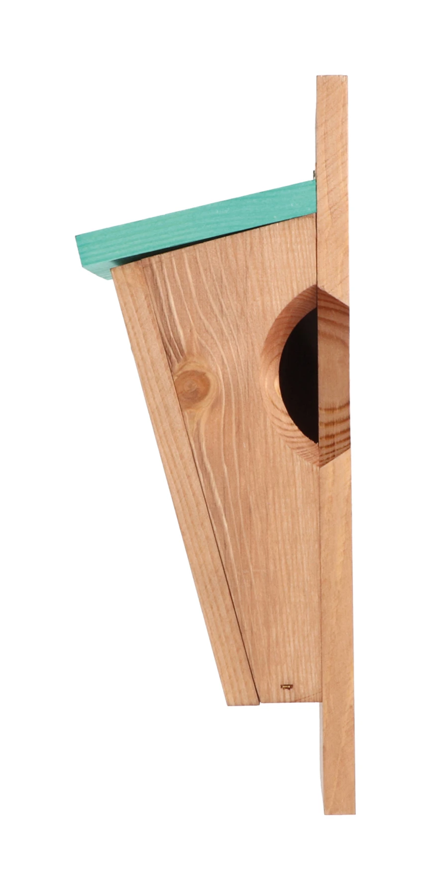Dieser Nistkasten aus FSC-Holz ist ideal für Kleiber, sie kriechen seitlich hinein. Hängen Sie den Kleiber-Nistkasten aus ca. 250 cm Höhe an einen Baumstamm.