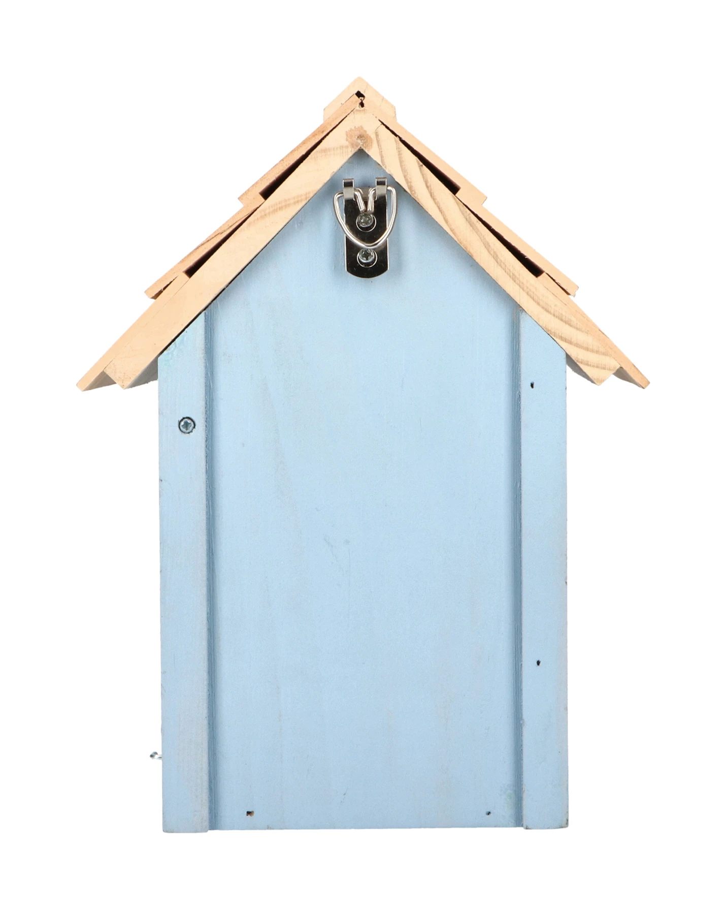 Strandhütte Nistkasten in Aruba Blue aus FSC-Holz mit einem Durchgang von 32 mm Durchmesser. Einfach an einen Baum oder eine Wand zu hängen und an der Seite zu öffnen für eine einfache Reinigung. Geeignet für viele Vogelarten, einschließlich Kleiber, Spatzen und Kohlmeisen.