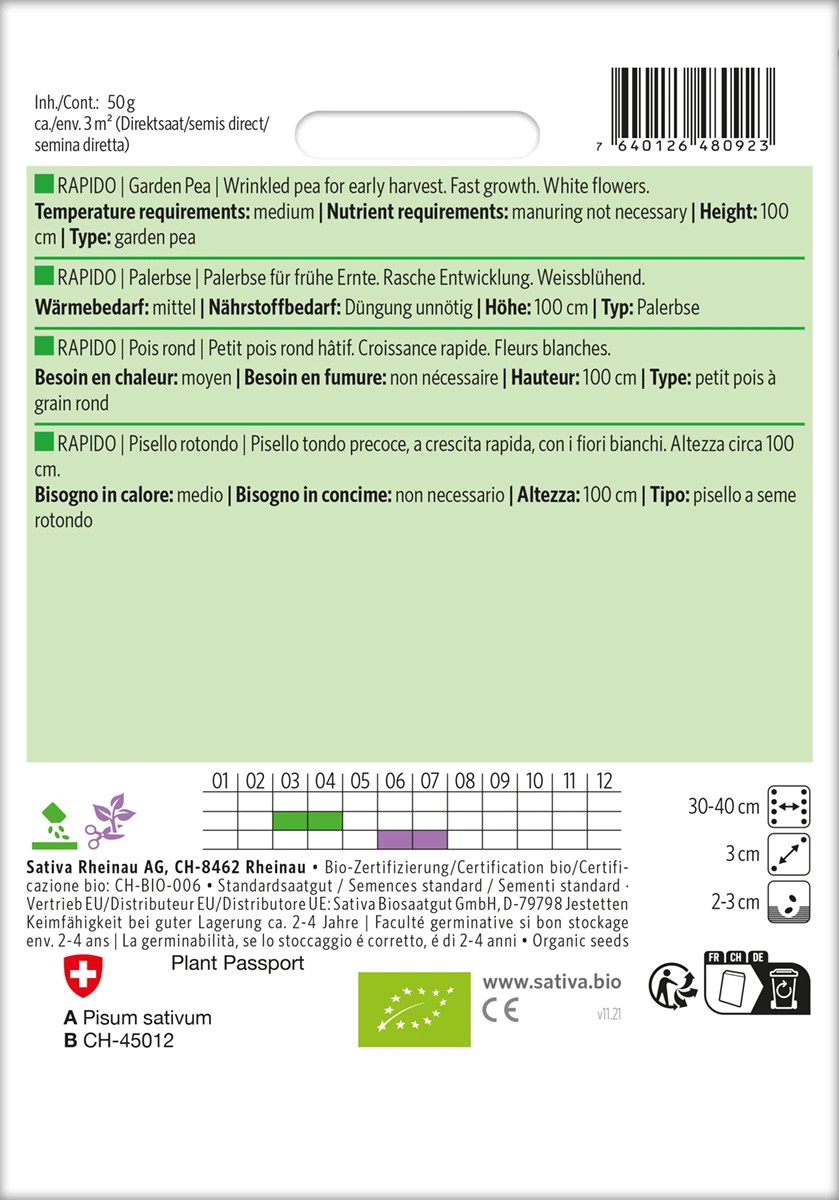 Palerbse für frühe Ernte. Rasche Entwicklung. Weissblühend.