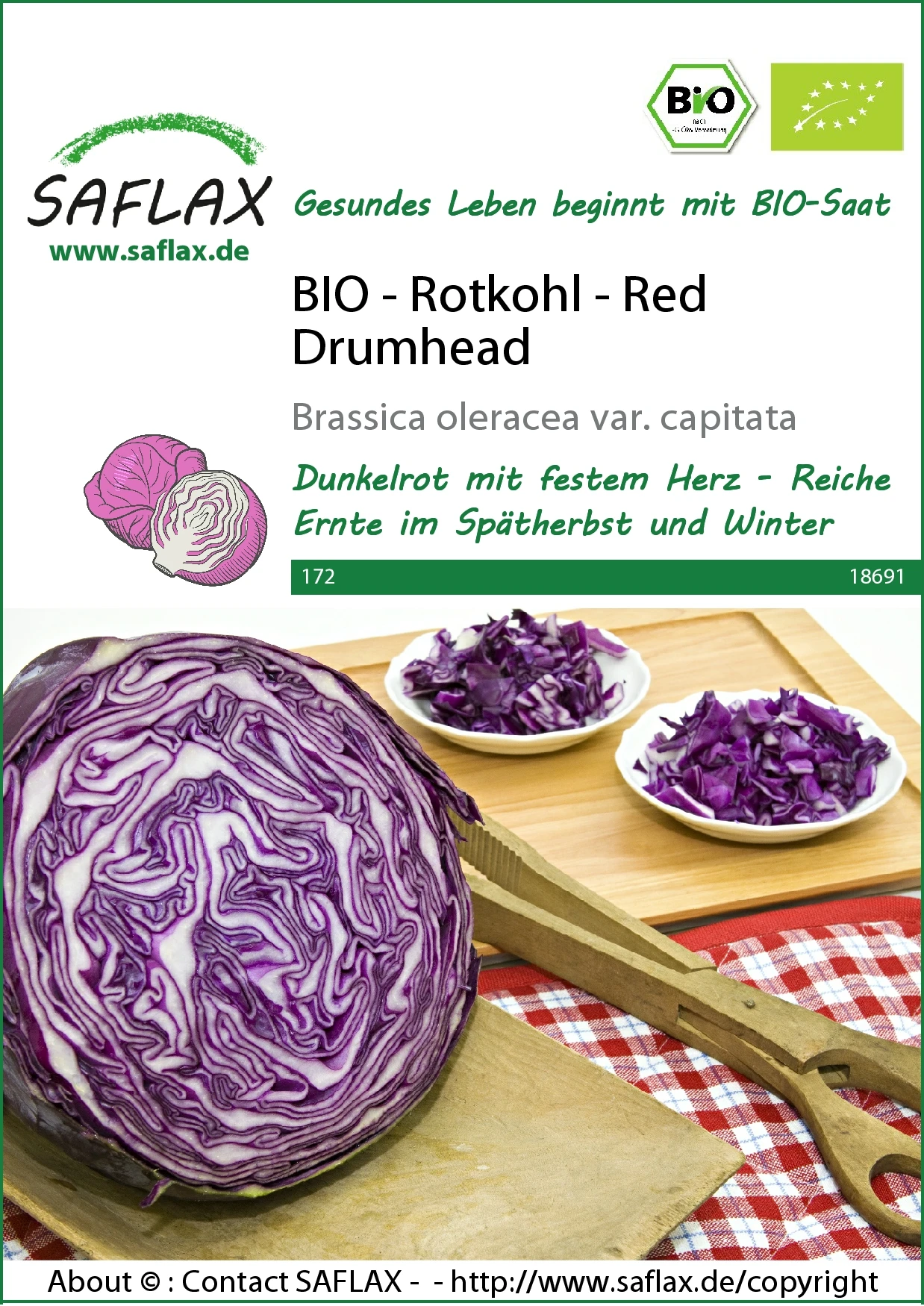 Red Drumhead ist eine historische Sorte, die dicht gepackte Blätter mit einem dunkelroten, festen Herzen entwickelt, die vom Herbst bis in den Winter hinein geerntet werden können.