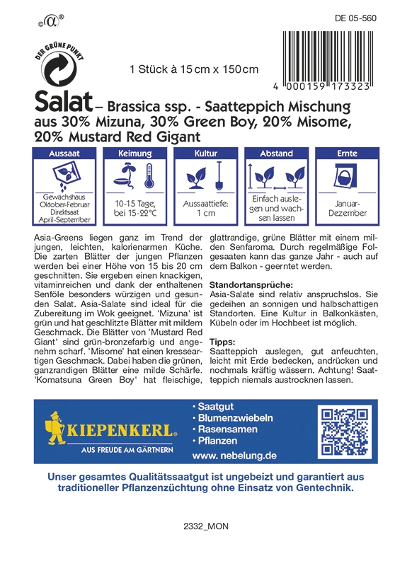 Asia-Greens liegen ganz im Trend der jungen, leichten, kalorienarmen Küche. Die zarten Blätter der jungen Pflanzen werden bei einer Höhe von 15 bis 20 cm geschnitten. Sie ergeben einen knackigen, vitaminreichen und dank der enthaltenen Senföle, besonders würzigen und gesunden Salat. Asia-Salate sind ideal für die Zubereitung im Wok geeignet. `Mizuna`ist grün und hat geschlitzte Blätter mit mildem Geschmack. Die Blätter von Mustard Red Giant sind grün-bronzefarbig und angenehm scharf. Misome hat einen kresseartigen Geschmack. Dabei haben die grünen, ganzrandigen Blätter eine milde Schärfe. Komatsuna Green Boy hat fleischige, glattrandige, grüne Blätter mit einem milden Senfaroma. Durch regelmäßige Folgesaaten kann das ganze Jahrauch auf dem Balkongeerntet werden.