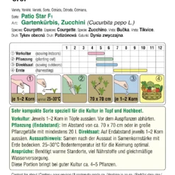 Die Pflanzen werden an einen Stab gebunden hochgeleitet. Die Pflanzenspitze darf nicht verletzt werden.Diese Portion bringt bei guter Kultur ca. 15 kg mittelgroße Zucchini.